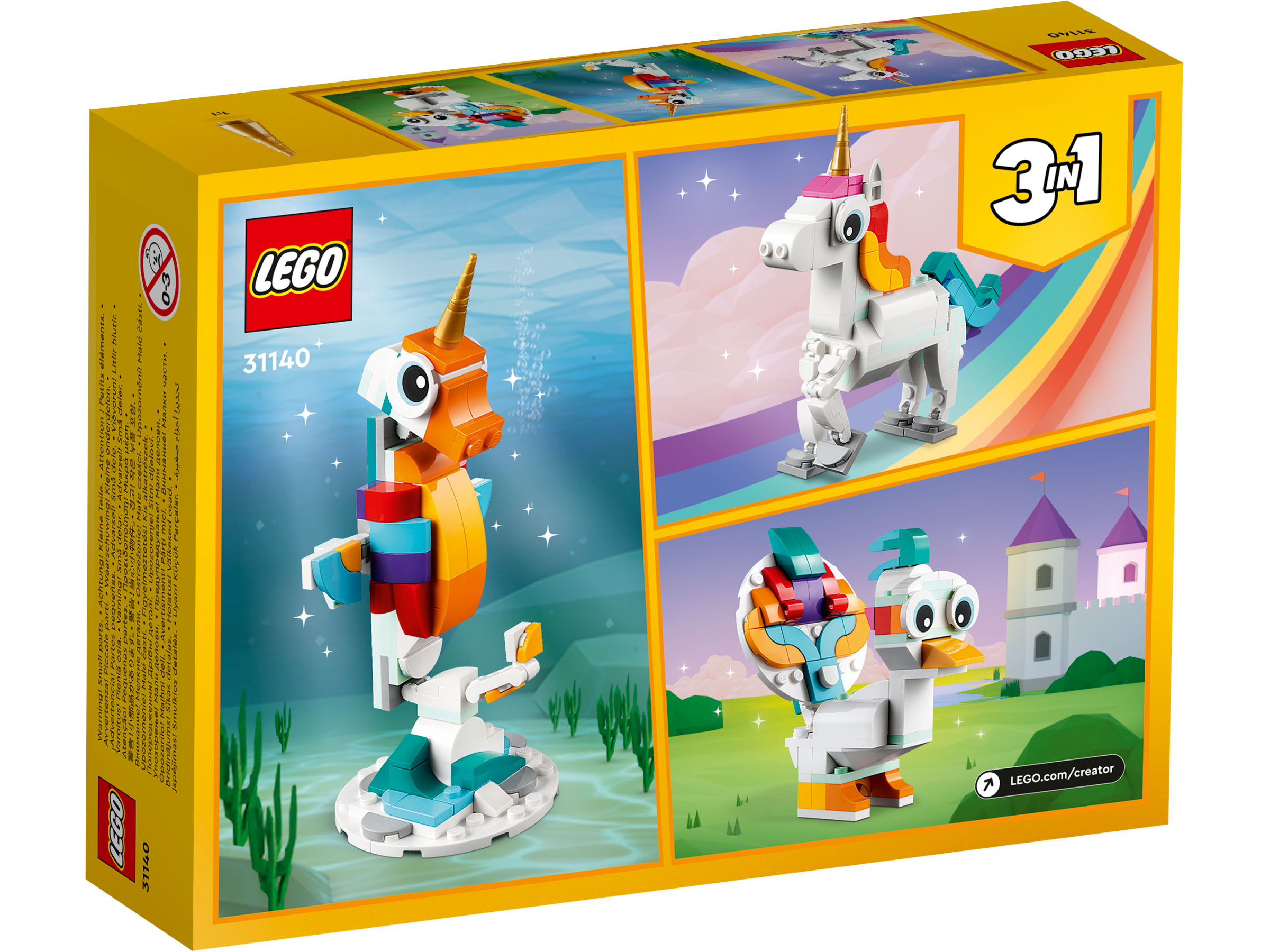 Magisches Einhorn (31140) ist ein 3-in-1-Bauset, das fantasievolle Kinder faszinierende Abenteuer in einer Fabelwelt darstellen lässt. Das Set beinhaltet ein Einhorn mit goldenem Horn, farbenfrohem Schweif und beweglichen Beinen und Hufen. Man kann die Figur in 2 Positionen bringen und entweder auf allen 4 Beinen stehen lassen und nur auf die beiden Hinterbeine stellen. Auf dem beiliegenden Ständer beeindruckt das Einhorn in dieser spektakulären Pose. Baue bunte Tiere aus LEGO® Steinen Dieses LEGO Creator 3-in-1-Set lässt kleine Baumeisterinnen und Baumeister unzählige Abenteuer mit 3 unterschiedlichen magischen Figuren darstellen. Dein Kind kann zunächst das Magische Einhorn bauen, das Modell dann in ein bewegliches Seepferdchen auf einem Ständer am Meeresgrund verwandeln oder es in einen beweglichen magischen Pfau mit farbenfrohem Schwanz umbauen. Aus den Steinen in diesem Set kann man jedoch auch eigene zauberhafte Fabelwesen erschaffen. LEGO Builder App Lade dir die LEGO Builder App herunter und freu dich auf ein völlig neues Bauerlebnis. Die enthaltenen Funktionen lassen dein Kind 3D-Ansichten der Modelle vergrößern und drehen, Sets speichern und den Baufortschritt verfolgen. Kinder ab 7+ Jahren Achtung! Nicht für Kinder unter 3 Jahren geeignet, da Kleinteile verschluckt werden können. Erstickungsgefahr! Geeignetes Alter: Ab 7 Jahre