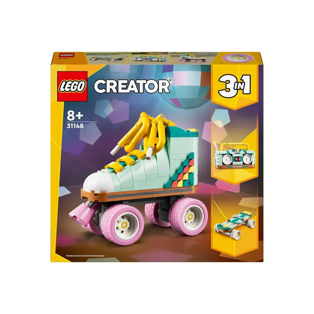 LEGO 31148 Rollschuh Kreative Kinder ab 8 Jahren können sich mit dem farbenfrohen LEGO Creator Rollschuh (31148) auf eine Zeitreise in die Vergangenheit begeben. Dieses LEGO Creator 3in1 Retro-Spielzeug bietet Kindern 3 verschiedene Bau- und Spielerlebnisse mit denselben Steinen. Das Bauset beinhaltet einen LEGO Rollschuh mit 4 rosafarbenen drehbaren Rädern, einem rosafarbenen Stopper und dicken gelben Schnürsenkeln. Auch diverse bunte Elemente liegen bei, damit dein Kind die Ferse des Schuhs mit eigenen Mustern verzieren kann. Dein Kind kann den Spielzeug-Rollschuh bauen und das Modell dann in ein buntes Mini-Skateboard oder in einen Ghettoblaster im Retro-Stil mit kurzer Antenne verwandeln. Alle 3 Modelle sind spektakuläre Hingucker, die man nach dem Spielen im Kinderzimmer als Retro-Deko oder Schreibtisch-Deko ausstellen kann. 3in1-Sets bieten Kindern mit unterschiedlichsten Interessen stundenlanges Spielvergnügen mit einer breiten Auswahl an Modellen. Dieses LEGO Creator 3in1-Rollschuh Set ist ein kreatives Geburtstagsgeschenk für 8-jährige Mädchen und Jungen. Der Spielzeug-Rollschuh ist 14 cm hoch, 16 cm lang und 7 cm breit. Enthält 342 Teile. EAN: 5702017585079 Achtung! Nicht für Kinder unter 3 Jahren geeignet, da Kleinteile verschluckt werden können. Erstickungsgefahr! Geeignetes Alter: Ab 8 Jahre